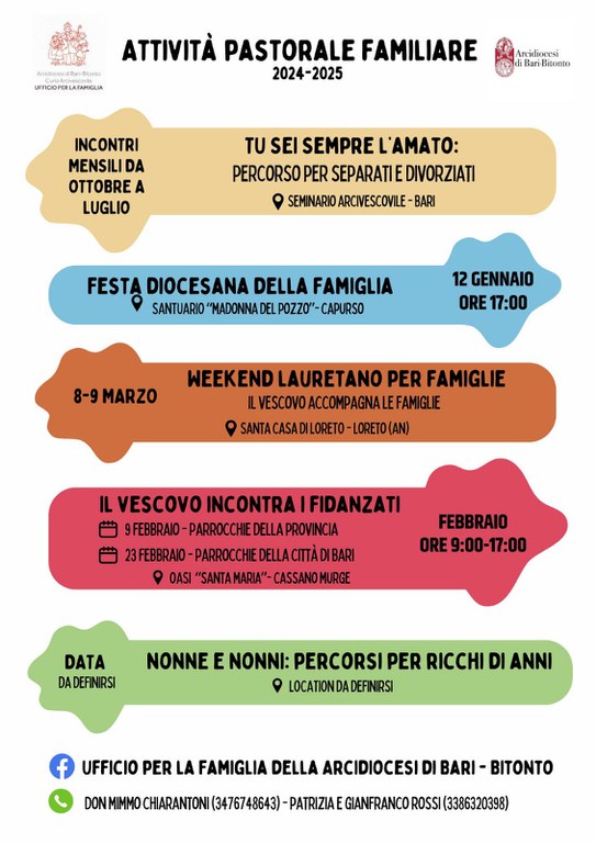 Le attività pastorali inizieranno con la Festa Diocesana della Famiglia che si svolge ogni anno nella domenica del Battesimo del Signore. Quest’anno il consueto appuntamento con la Celebrazione Eucaristica presieduta da Padre Arcivescovo, seguita da un momento di condivisione tra le famiglie, si svolgerà il 12 gennaio a Capurso presso il Santuario “Madonna del Pozzo”.