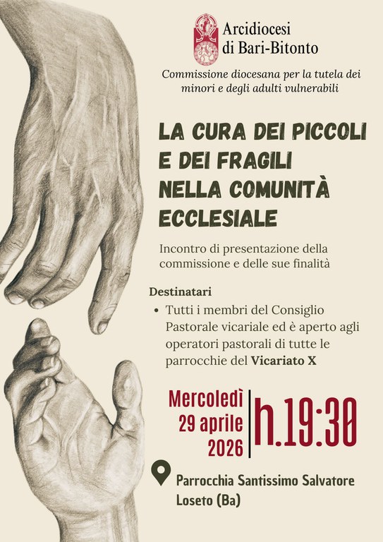 Il primo di questi incontri si svolgerà mercoledì 29 aprile 2026, alle ore 19.30 nel Vicariato X, presso la Parrocchia del Salvatore in Bari-Loseto. sarà presente don Gianni Giusto, referente diocesano della Commissione diocesana.