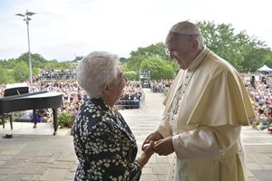 Nata il 7 dicembre del 1943 quando Chiara Lubich, poco più che ventenne, nel pieno della seconda guerra mondiale, si consacra a Dio e con altre giovani va a fondare il primo Focolare, oggi l’Opera di Maria, come volle chiamarla Lubich, è presente in 182 Paesi, ne sono membri circa 110.00 persone, mentre due milioni sono gli aderenti e i simpatizzanti. A Loppiano, nata come la cittadella della “formazione e della testimonianza” del movimento, i ‘focolari’, le fabbriche, i laboratori e le sedi delle diverse scuole, sono sparse tra le case coloniche di privati cittadini. Sceso dall’elicottero proveniente da Nomadelfia, accolto dalla presidente, dal copresidente Jesús Morán, e del vescovo di Fiesole, monsignor Mario Meini, dopo l’abbraccio con la folla, il primo saluto il Papa lo riserva al Padrone di casa: si ferma infatti per pochi minuti nel santuario Maria Theotokos, che - pensato da un’équipe tutta al femminile di architette, scultrici, pittrici che si ritrovano nel centro Ave Arte – realizza un perfetto connubio tra teologia e arte.